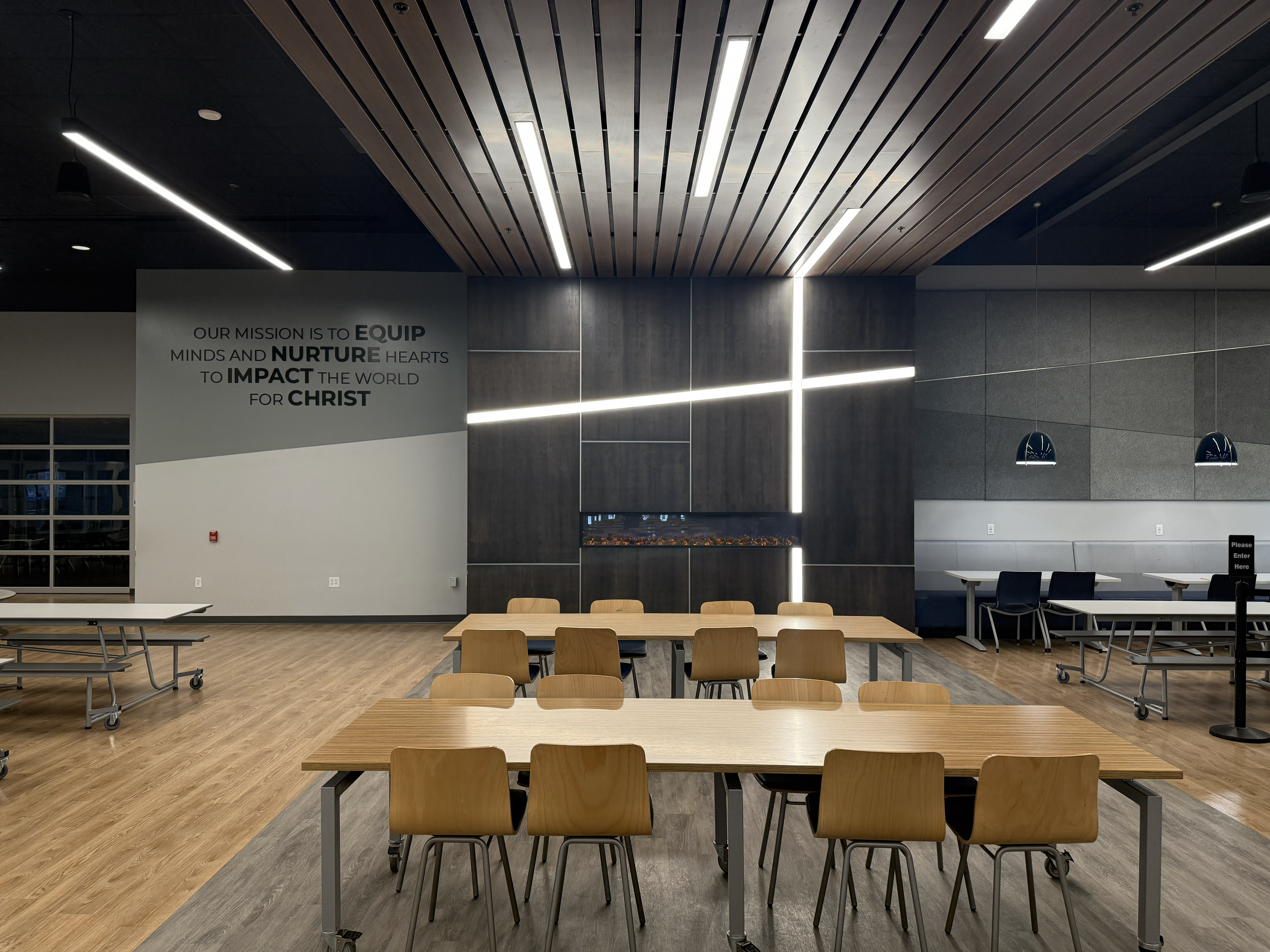 The addition includes a new secured entry lobby, 14 new classrooms, a new 300-seat chapel/auditorium along with supporting technology rooms and support spaces (teacher work room, flex/study room, etc.). There will also be a new ICC 500 two-story storm shelter that can accommodate the entire school population. Existing renovations include reconfiguring classroom and office spaces, constructing a new open stair to connect the first and second floor and updating finishes in the existing hallways. Site work includes re-routing the existing fire lane, adding exterior monument signage, reconfiguring the elementary entrance paving and drive, adjusting the parking and bringing the site storm water management up to code.